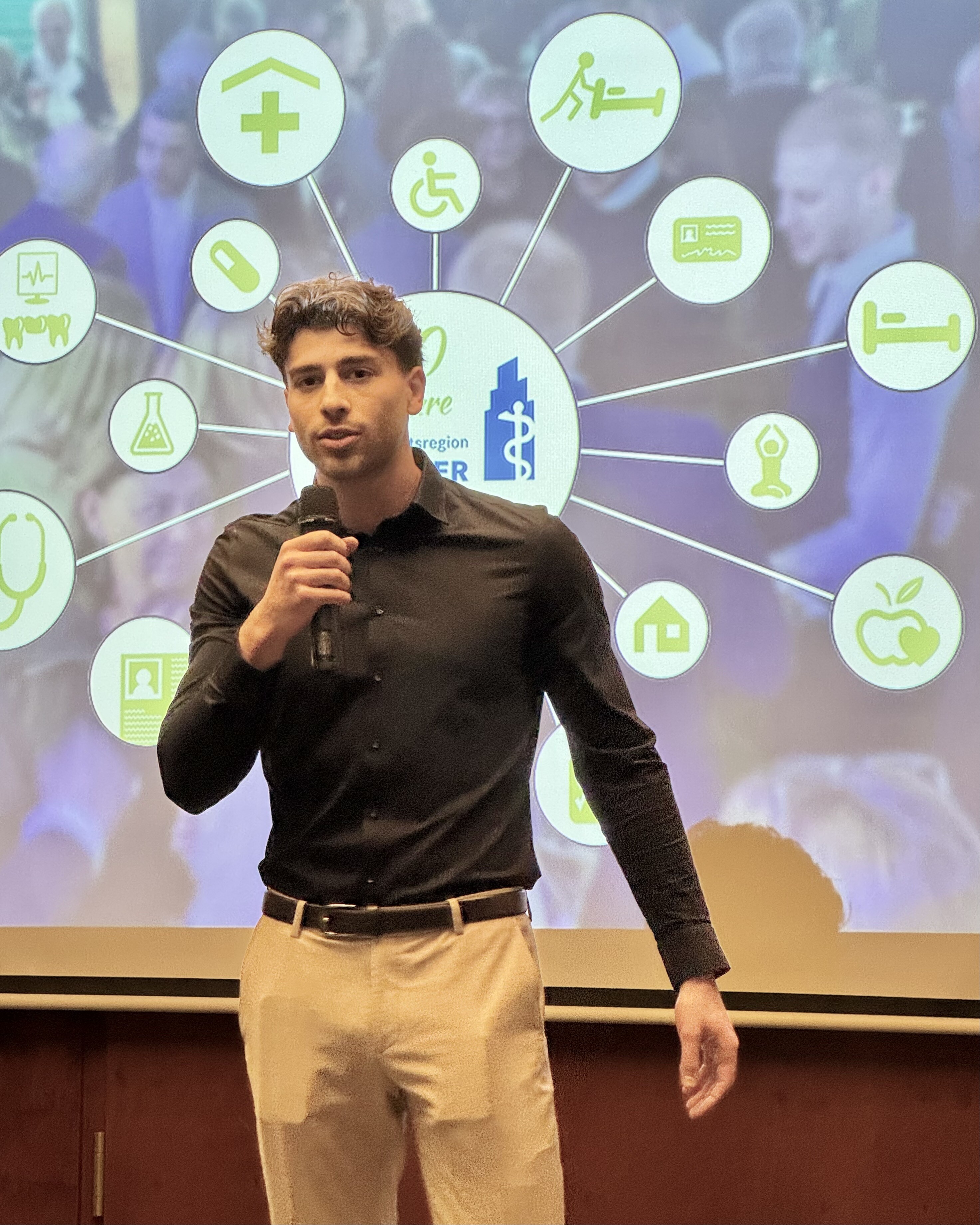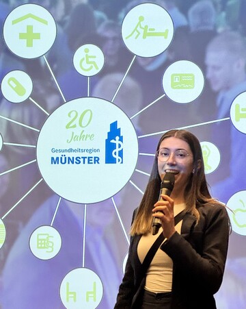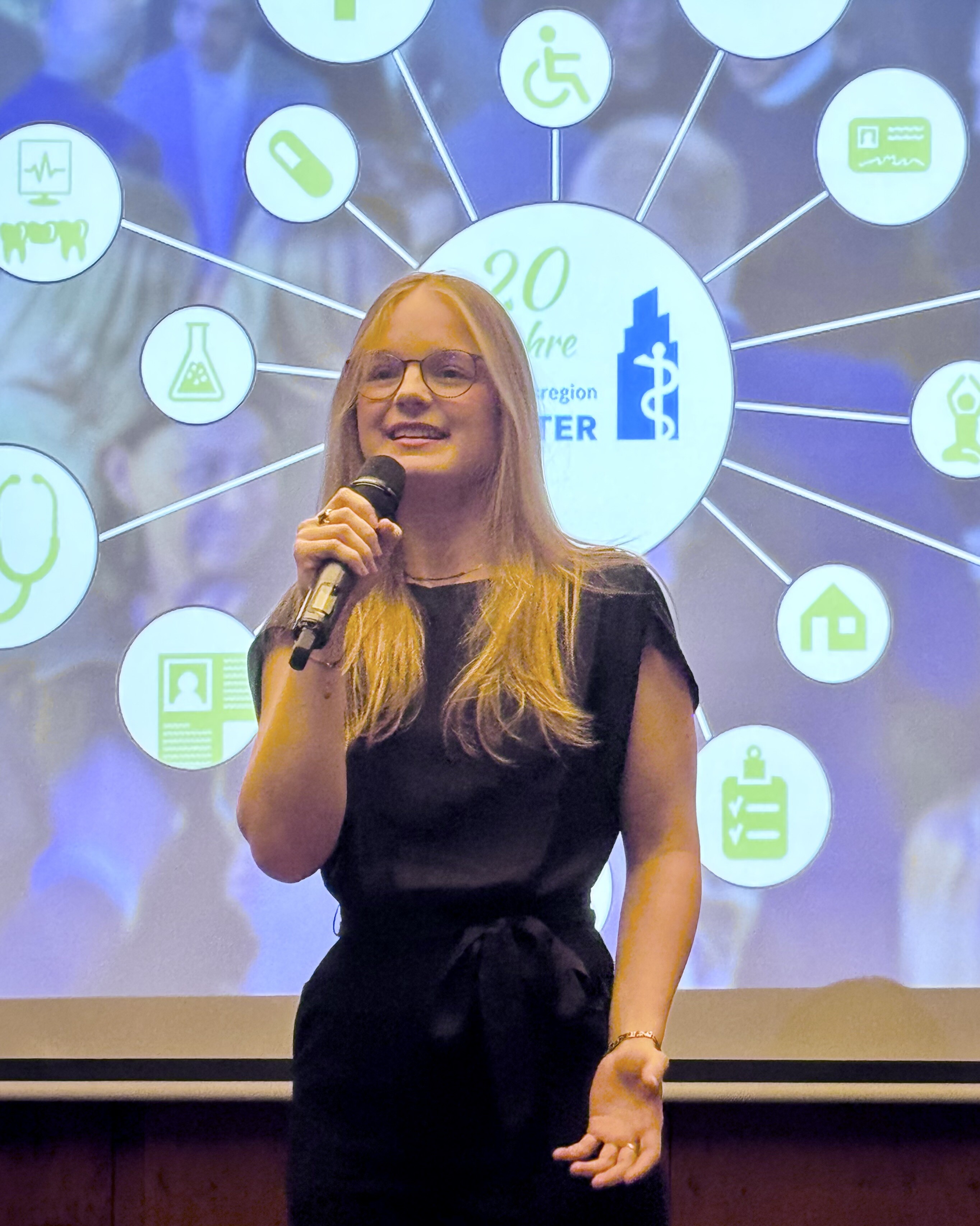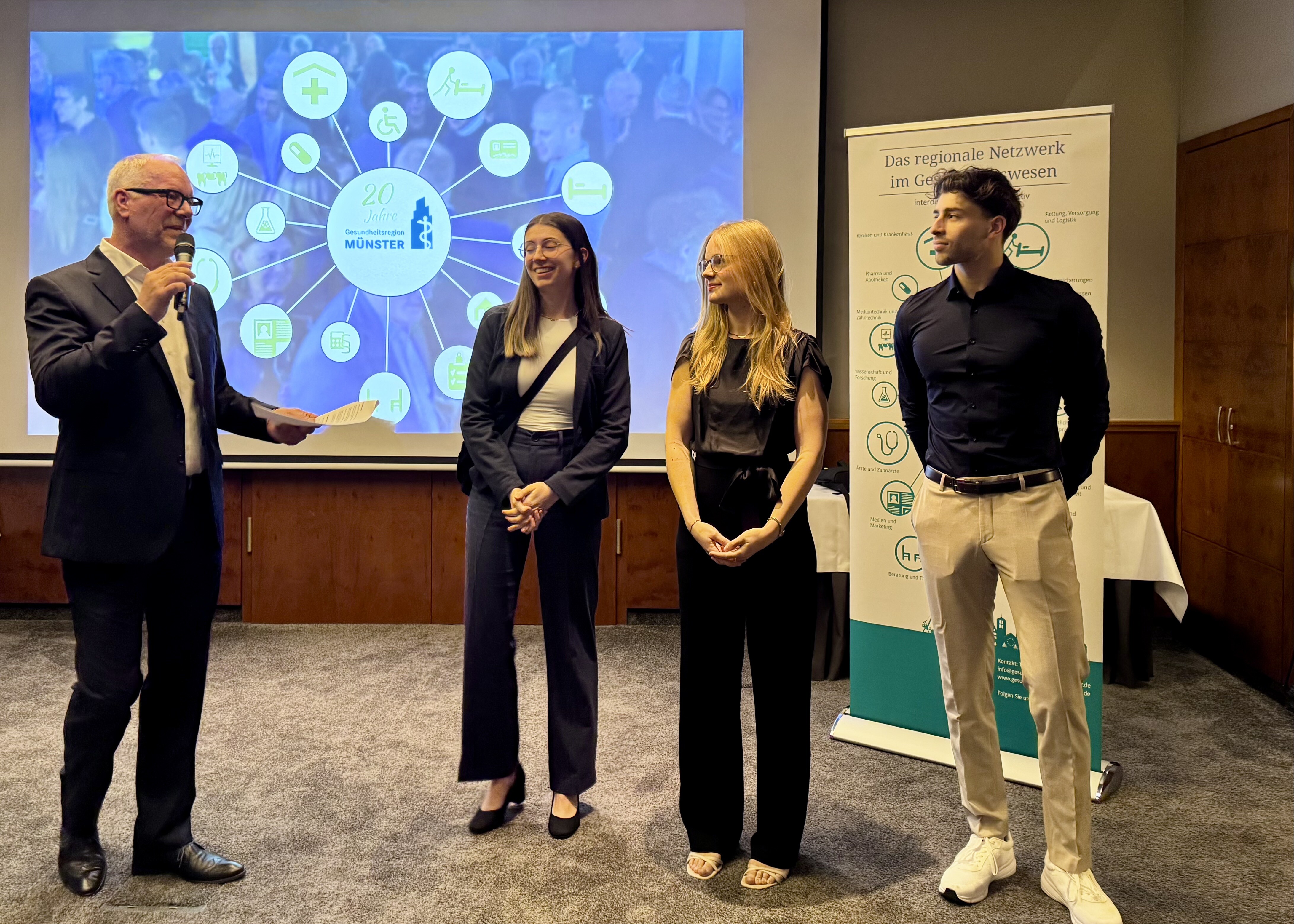 Statt eines klassischen Impulsvortrags stellten sich in diesem Jahr drei junge Stipendiatinnen und Stipendiaten vor, deren Studium durch Mitglieder der Gesundheitsregion unterstützt wird. Nacheinander berichteten sie von ihrem Werdegang, ihrer Motivation sowie ihren Erfahrungen und Zielen – im Kontext ihres Pharmazie- bzw. Medizinstudiums. Mit ihrer erfrischend authentischen Art begeisterten die drei Nachwuchskräfte das Publikum - und warben dabei auf sympathische Weise für weitere Unterstützung.